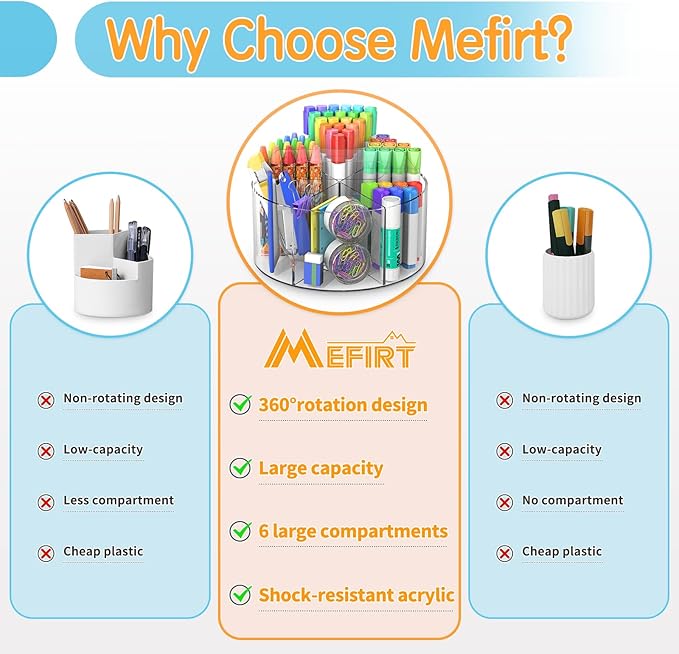 - 360°Rotating Design Pencil Holder: Art supply storage organizer is designed with a 360°rotatable base, so you can quickly and easily get what you want. And this kid marker organizer comes with a handy handle. With a handy handle design, you can move the clear acrylic office organizer with your hand. Mefirt rotating art supply organizer makes your desktop clean and tidy!