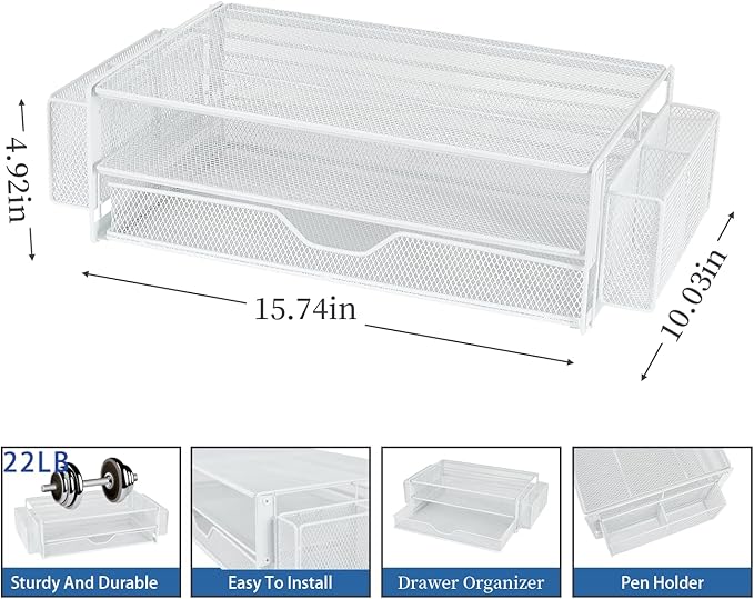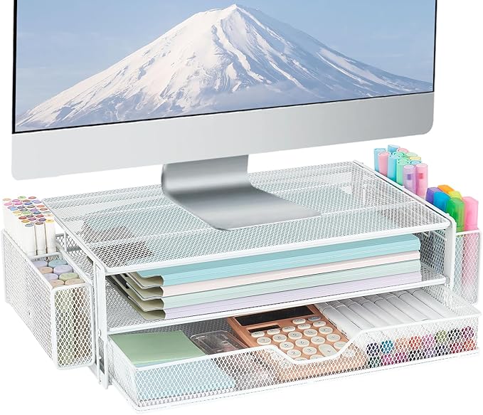 - Space Saving: Our dual-tier desktop organizer with drawer and 2 pen holders stores office supplies and office desk accessories neatly. As a purpose monitor riser, it keeps your workspace organized, helping you focus and work efficiently