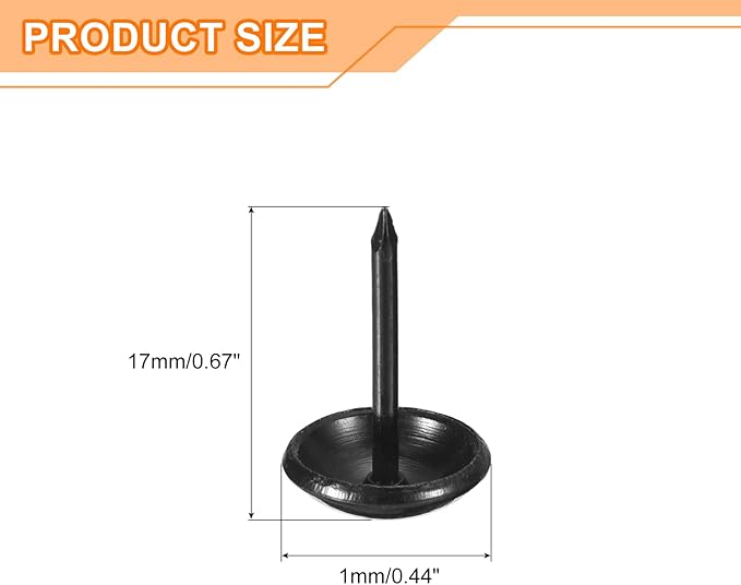 - Specifications: Material: Carbon steel; Color: Black; Diameter of nails head: 11mm/0.44inch; Shank length: 17mm/0.67inch; Package Content: 50Pcs x Upholstery Tacks Nail Pins