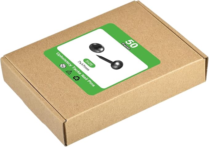 - Specifications: Material: Carbon steel; Color: Black; Diameter of nails head: 7mm/0.28inch; Shank length: 17mm/0.67inch; Package Content: 50Pcs x Upholstery Tacks Nail Pins