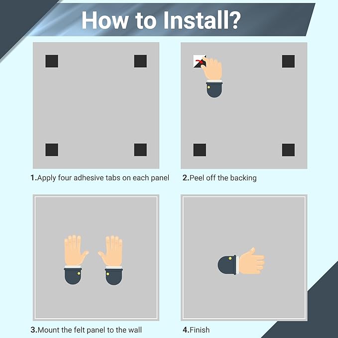 - Safe Removable Adhesive: 11.8 "x11.8" felt panels with 24 acrylic double-sided tapes, safe for your walls, suitable for working perfectly on flat, textureless, dust-free, dry surfaces and can be easily removed without damaging the wall paint, a perfect solution to pin your notes and messages in any office, home or commercial environment