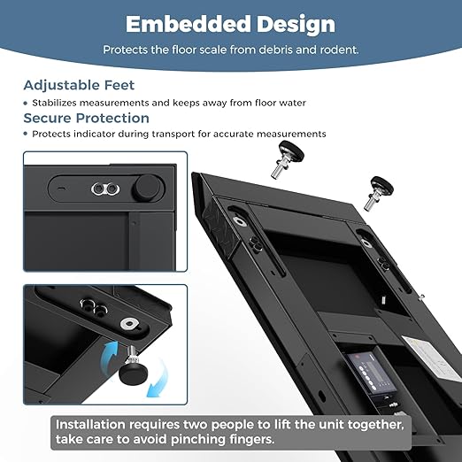 - 56.3" x 20" Carbon Steel Platform: This robust floor scale features a channel steel frame for exceptional stability. The diamond plate surface ensures that animals remain steady during weighing, while the well finish protects scale from dust and rust. The scale is equipped with four adjustable non-slip feet, allowing for easy calibration to accommodate various floor conditions. Additionally, the embedded weighing sensors are designed to keep from debris and rodents.