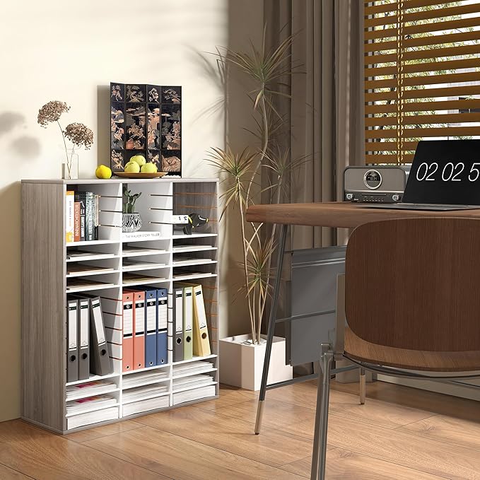 EasyPAG Mail Organizer Countertop, Wood Literature Organizer with Adjustable Shelves, Student Classroom Mailbox for School, Desktop Paper Sorter for Office Home, 48 Compartments, Retro Gray/White