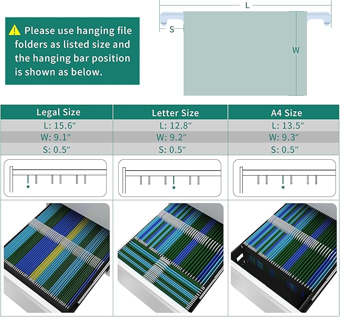 - 【 Large storage drawer 】 Three drawer file cabinet provide large storage space, each drawer provides movable hanging bar, can allow letter size documents to be hung horizontally and vertically, legal and A4 size documents can only be hung vertically, not horizontally; Please carefully measure the size of your desk and documents before purchasing, so that you can better store and organize your documents.