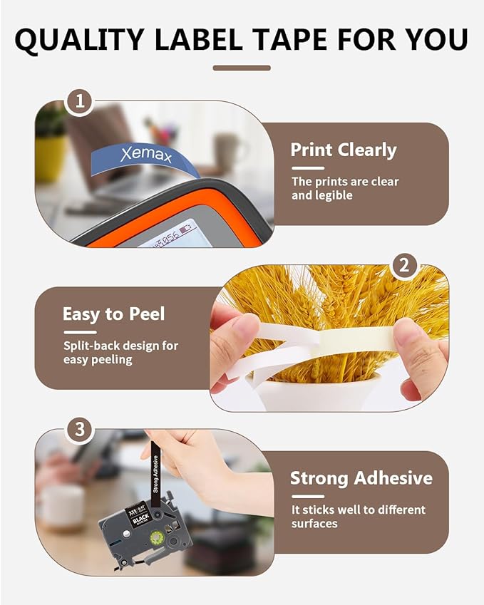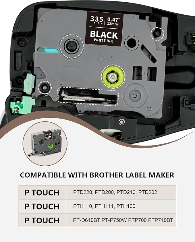 - Compatible for Brother PTouch Tape 12mm Label Makers: PT-D220, PT-D410, PTD460BT, PT-2040W, PT-2040SC, PT-2040C, PT-D200, PT-D201, PT-D202, PT-D210, PT-D215e, PT-E100, PT-E105, PT-E110, PT-H100, PT-H105, PT-H110, PT-H111, PT-H200, PT-P300BT, PT-D400, PT-D450, PT-E300, PT-H300, PT-D600, PT-E500, PT-E550W, PT-H500, PT-P700, PT-P710BT, PT-P715eBT, PT-P750W, PT-D800W, PT-E800W, PT-P900, PT-P900W, PT-P950NW, PT-P910BT