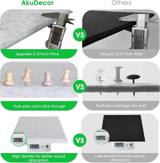 - 【Thickened Cork Boards】Our cork board alternatives have higher thickness (25% thicker) and density (35% denser) than traditional cork boards, which means better durability and sound absorption. It prevents push pins from sticking through the felt board and damaging the wall.