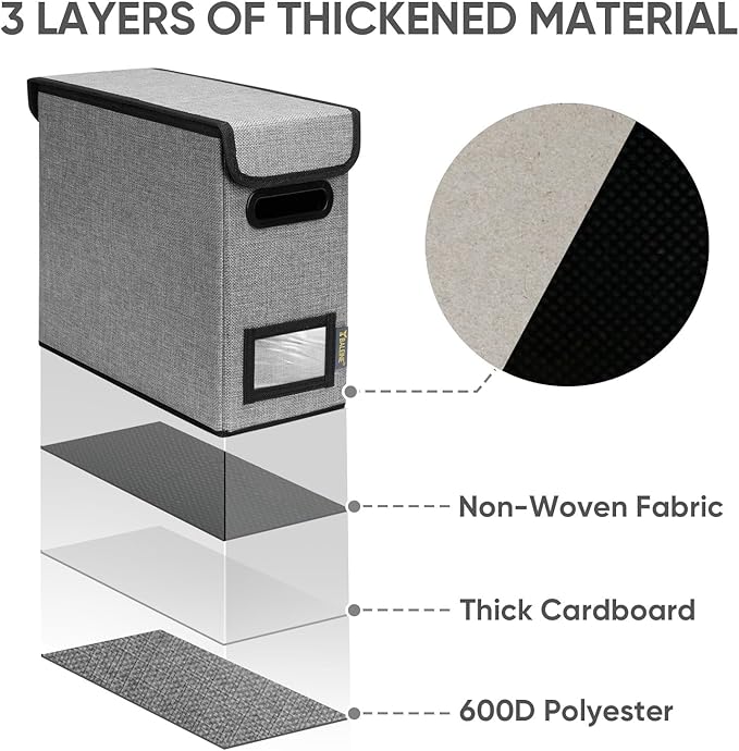 - [DURABLE MATERIAL] The outer layer of our filing box is crafted from high-quality polyester fabric and reinforced with thick cardboard in the middle. This construction ensures that the box maintains its shape and provides better bearing capacity for important documents and files. Its textured appearance can also serve as a stylish decorative element in any office or home