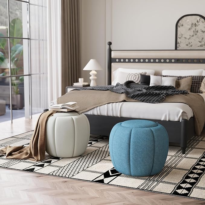 - 【Chic Design】 This Ottoman stool has a uniquely beautiful appearance, somewhat resembling a pumpkin. It also serves as a lovely decorative piece that makes your room more beautiful and unique. This makeup stool is made of a soft and comfortable material. Whether used as a footrest or a vanity stool, this stool provides maximum comfort.