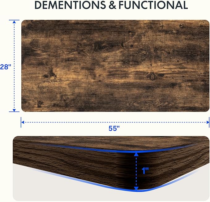 - AMPLE WHOLE-PIECE DESKTOP: With its whole-piece 1β eco-friendly desktop, this standing desk provides plenty of room for your computer setup, documents, and accessories, creating a well-organized and productive work environment. Due to hand measurements, desktop dimensions may vary slightly by 0 to 1β.