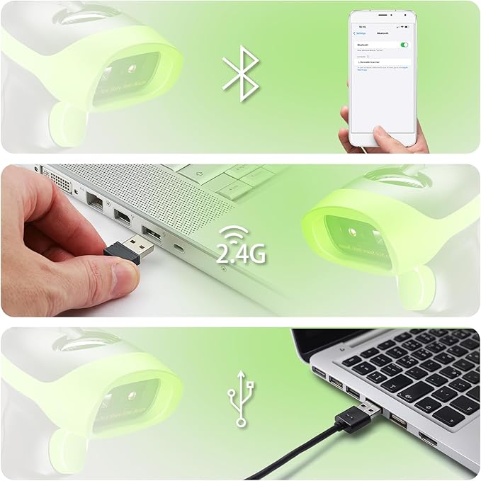 - ➤Auto Scanning & Storage Mode - Manual Scan & Auto-sensing Scan & Continuous Scan. Two working mode: Instant upload mode / storage mode. Scan and store barcodes, then update the data to your device when you come back entering the wireless transmission range. Sometimes the self-sensing scanning function is in the inactive stage, please contact us and be at your service at any time.