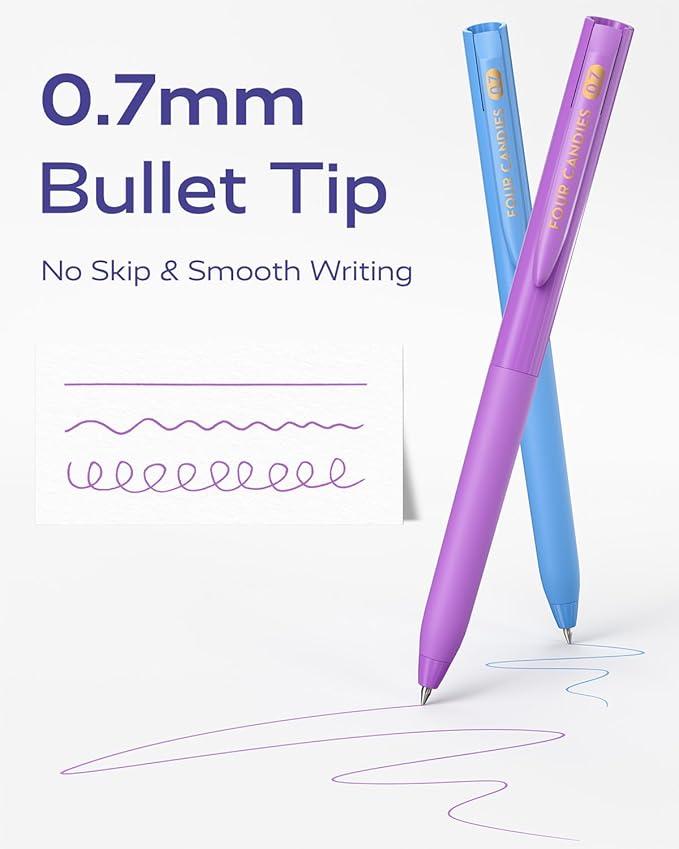 - QUICK DRYING PENS: Say goodbye to smudges with Four Candies fast-drying 0.7mm pens colorful. The smooth ink flow ensures a seamless writing experience, while the quick-drying ink prevents smudgingβideal for left-handed writers who often face this issue. Note: The sealing wax needs to be removed before writing