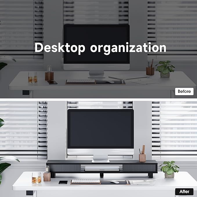 - 【Space Optimization】: Experience effortless desk organization with our monitor stand, 2-tier storage space, 42.5 inches long monitor stand, 3 high capacity compartments, and a convenient sliding drawer, and cable management openings. Streamline your workspace and make your work a breeze