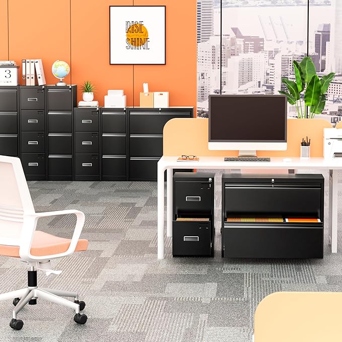 - 【Unique design】Lateral file cabinet is fully suspended drawer system with ball bearings makes the switching operation easy and noiseless, which it friendly for others to work with and always keeps a quiet environment. Non-mar padded base prevent from sliding and scratching floors.
