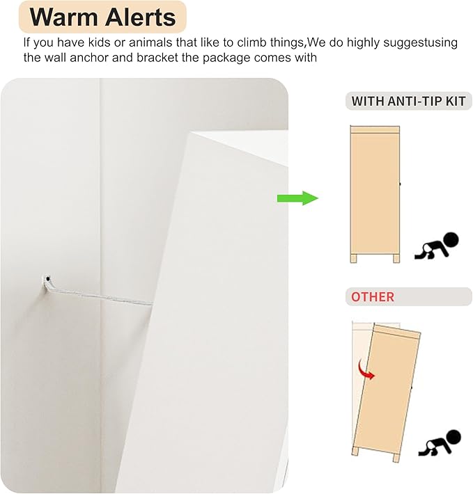 - Stability and Security: This tall storage cabinet is equipped with a robust base and anti-tipper mechanism that secures it firmly to the wall,eliminating any tipping concerns. Protect your and your family's safety, offering peace of mind even in the presence of spirited playful pets.Elevate your storage solutions with this stable, durable, and stylish pantry cabinet