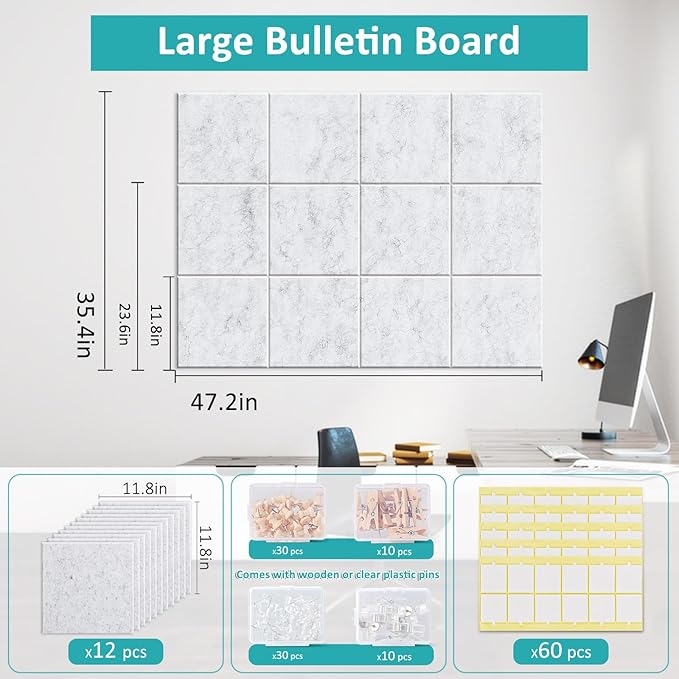 - 【Cork Board Set】:Contains 12 pcs of 11.8" x 11.8" felt wall tiles, 0.35 "thick, 60 adhesive pieces, 30 push pins and 10 clips. According to their needs can be combined into 36" x 24", 48" x 36", 72" x 48", 96" x 48" and so on. Felt corkboard are more tear-resistant, denser and longer lasting than traditional cork and paper bulletin board.