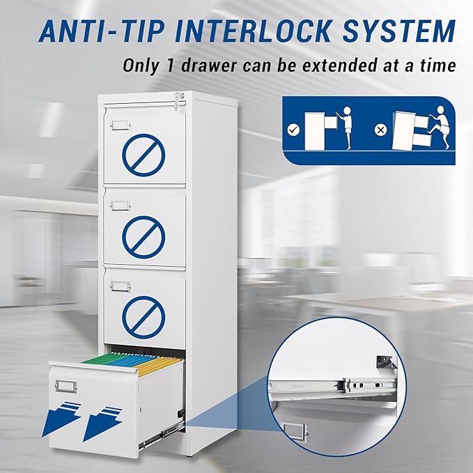 - LOCKABLE 4 DRAWERS FILE CABINET - All the file drawers can be locked by one lock, It is very convenient to control the whole filing cabinet with one key.