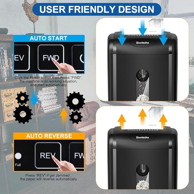 - 【Convinient Design &15 Minutes Shredding】With 15 minutes Non-Stop Shedding,overload operation of the Home shredder machine will Auto start overheating protection with 45 munites cooling time. It include 3-mode control switches (FWD,Power and Auto reverse functions simplify shredding and paper jammed clearing processes
