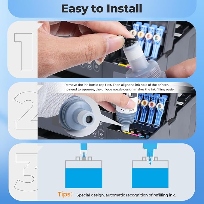 - Our bottles has auto-stop nozzle design, easy filling, no spills, no drip, no need to squzze the ink bottles! Say goodbye to the hassle of manually squeezing and potentially spilling ink.