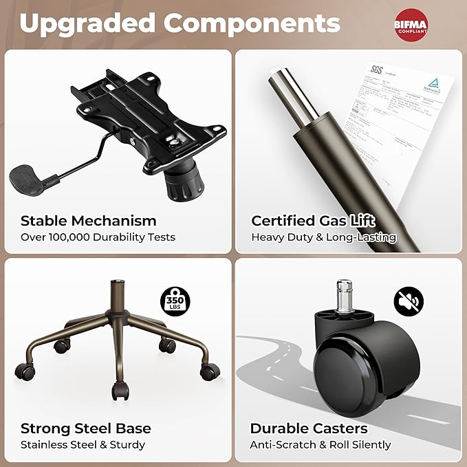 - Sturdy Construction: This padded task armchair features strong metal frame, curved backrest brackets that follow the curve of the human spine for stress relief, tested adjustment mechanisms and gaslift for stability even for tall and strong people, and high-quality 360Β° swivel rolling rotating casters avoid scratching the floor, can support up to 300 lbs. Whether you're working or relaxing, this modern chair offers a comfortable experience