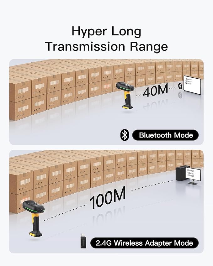 - Wide Compatibility & Extended Transmission Range: Supports three connection modes—2.4G wireless, Bluetooth, and wired. Compatible with Windows, Mac, iOS, Android, iPad OS, and Linux, catering to various scanning needs. In open environments, the transmission distance reaches up to 100 meters, while in indoor settings, it extends to 60 meters