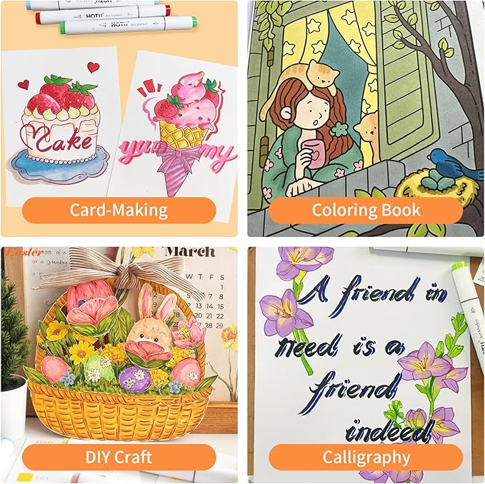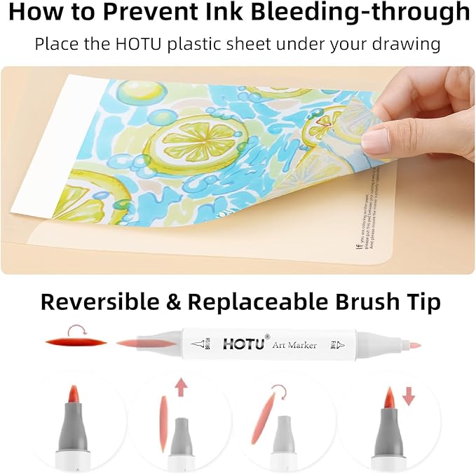 - ANTI-BLEEDING PAD :Our HOTU alcohol markers come with a matching anti-bleeding pad. You no longer need to worry about dirtying the table or other paper when creating, thus keeping the creative environment clean and perfect at all times.(NOTE: As alcohol based markers like all other brand alcohol markers, they will Bleed through regular coloring paper, except very thick paper, marker paper)