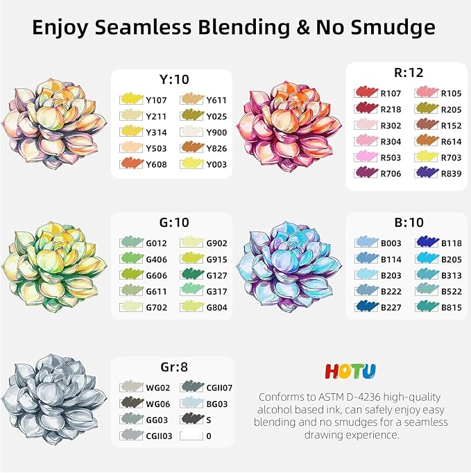 - SMOOTH TRANSITION: Our HOTU markers alcohol-based ink dries quickly, ensuring that your art is always clean, crisp, smudge-free, and alcohol-based ink can be easily mixed and blended to create paintings with natural gradients, perfect for art enthusiasts ,designers and experienced artists.Also, no more frustrating smudges or wet ink ruining your work