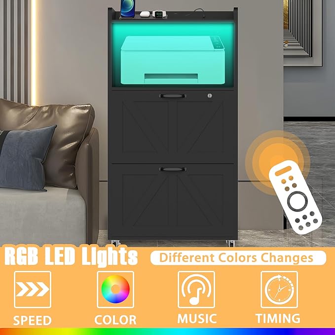 2 Drawer File Cabinet On Wheels & Charging Station, Wood Filing Cabinet with Lock & LED Light, Large Storage Printer Stand for Home Office, Black