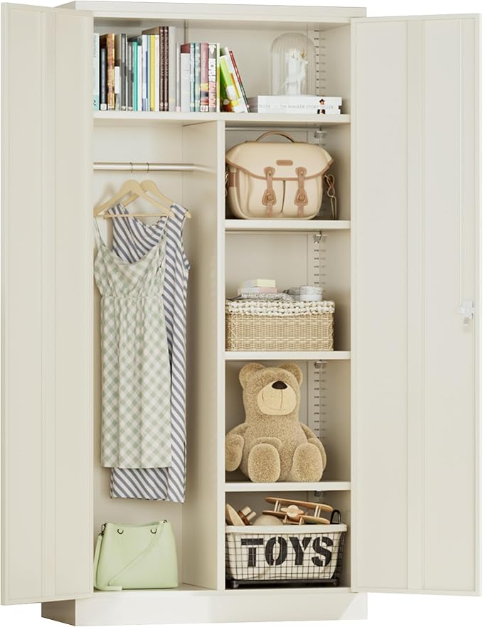 - [ Large Capacity Design ]: Greenvelly metal wardrobe closet size: 72" H * 18" D * 36" W . Equipped with an adjustable clothes pole on the left side for easy hanging of various clothes. There are 3 adjustable shelves on the right side to meet different storage needs. The simple and atmospheric metal wardrobe provides you with a variety of color choices, suitable for various spaces such as bedrooms, changing rooms, bathrooms, garages, etc.