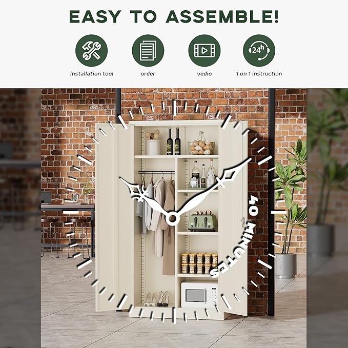 - [ DIY Assembly & After-sales ]: Greenvelly metal closet storage cabinet is carefully packed with upgraded foam board to ensure safe transportation. The packaging contains detailed assembly instructions and necessary auxiliary tools, allowing you and your partner to easily collaborate and complete the assembly quickly with 1-2 people. Encountering any assembly difficulties? Don't worry, Greenvelly's professional after-sales team will provide you with timely support and service.