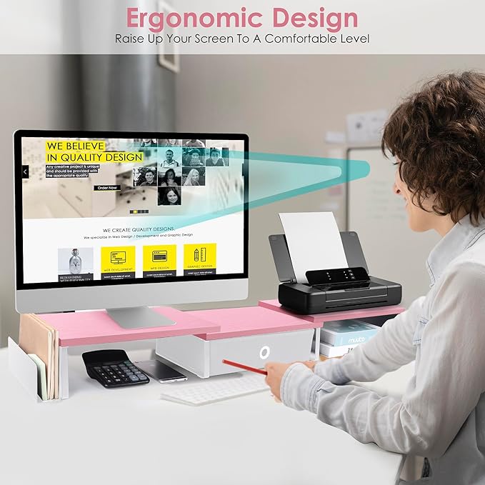 - 【Sturdy Computer Stand】Dual monitor riser with drawer is made of high quality MDF wood and solid steel legs. Desk shelf for monitor with metal feet can provide strong support and load-bearing. Non-slip rubber pads could prevent slipping or damage to your desk and it is a good desk organizer in pink for women.