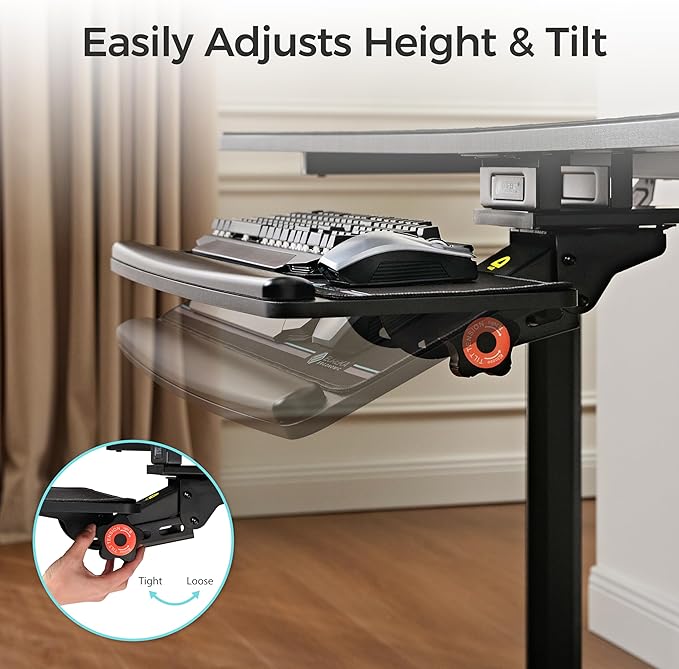 - Ergonomic Full Motion Keyboard Tray: The height adjustable keyboard tray is designed to provide a comfortable typing experience with its full motion feature. The keyboard drawer allows a height-adjustable range of 5.8”. The keyboard holder can rotate/swing 360°horizontally and tilt 43°vertically to your required position and can be pulled forward or backward. Find the perfect position for your typing height and the comfortable position for your arms. This helps to improve typing posture, reduce tension and fatigue, and make it easier for you to work for longer periods of time.