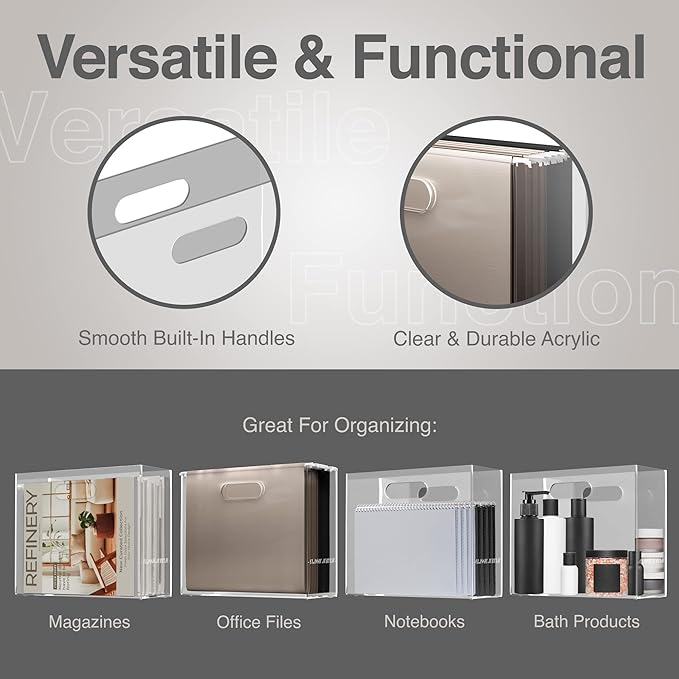 - Function: Keep magazines on display with this sleek and sturdy acrylic holder. This versatile acrylic box is suitable for magazines, books & letter-size hanging file folders. It can also be used as a bin for any needed storage.