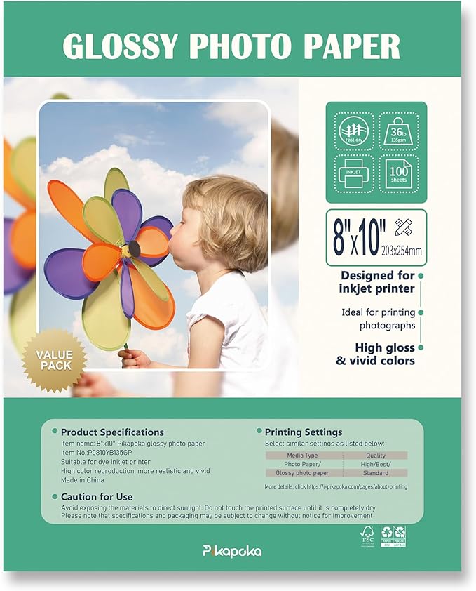 - Pikapoka thin glossy photo paper 36lb(135gsm), size: 8x10 in, 100 Pack