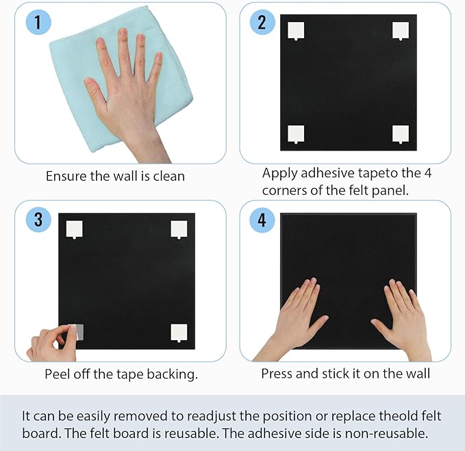 - 【Detachable DIY & Wall Friendly】: The cork board set comes with removable adhesive sticker, no nails required, easy and strong installation, removable and repositionable, flexible to use, Note: Please use the felt tile boards on smooth surfaces, avoid using them on peeling, dusty or uneven surfaces. Adhesive can be removed using a hot hair dryer.