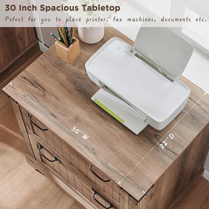 - 30 Inch Spacious DesktopοΌThis office filing cabinet is a powerful assistant for your efficient work. 30 inches spacious desktop has a rustic finish with a delicate touch, being stain-resistant and easy to clean. No matter if you use it intensively for a long time or accidentally cause bumps or water spills, it will always remain aesthetically pleasing and practical.