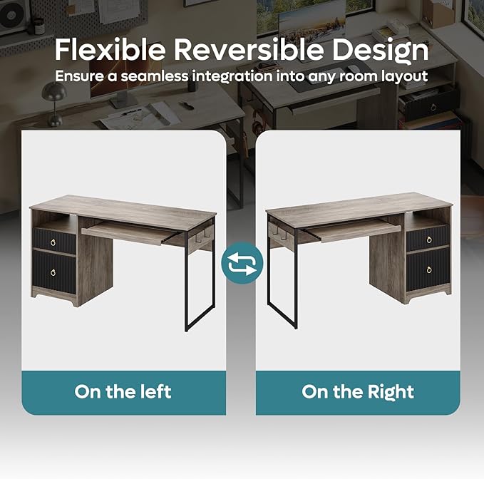 - User-Friendly Design: The home office desk features a flexible keyboard tray for comfortable typing. Its reversible pedestal can be installed on either the left or right side, ensuring seamless integration into any room layout. Additionally, two practical hooks provide convenient storage for headphones or other accessories