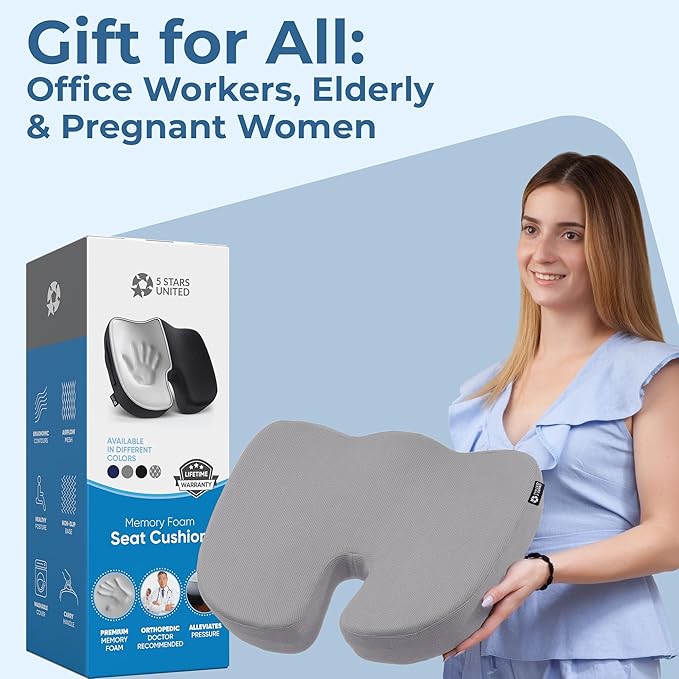 5 STARS UNITED Seat Cushion for Tailbone Pain Relief โ Large Memory Foam Lifting Pillow for Coccyx, Hip, Sciatica & Post-Surgery Recovery โ Wheelchair, Car, Desk, Gaming & Office Chairs, Light Gray