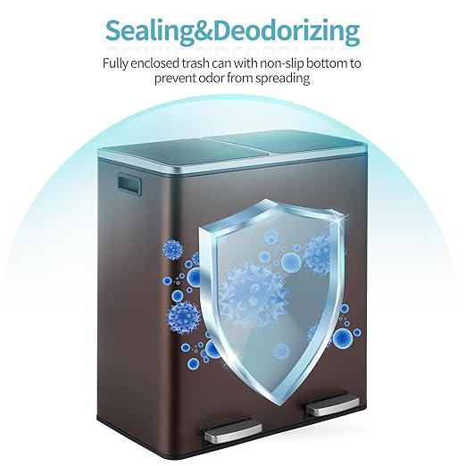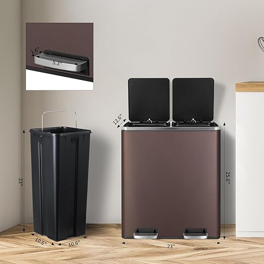 - 2ร8-Gallon Compartments: 16-gallon step trash can has two compartments, combining garbage and recycling. Completely separated dual garbage and recycling can also avoid the smell of garbage. 2 removable inner buckets increase convenience
