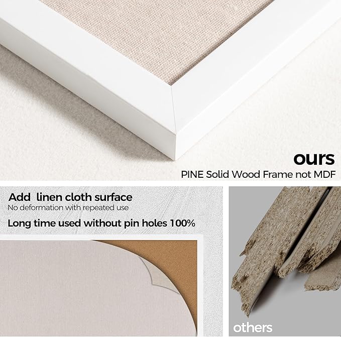 - Pine Frame Material: Our cork boards for walls is made of 100% pine wood which has well self-healing ability and repairability. The pin board features a four-ply splint design that is strong and thick enough not to be punctured by thumbtacks.