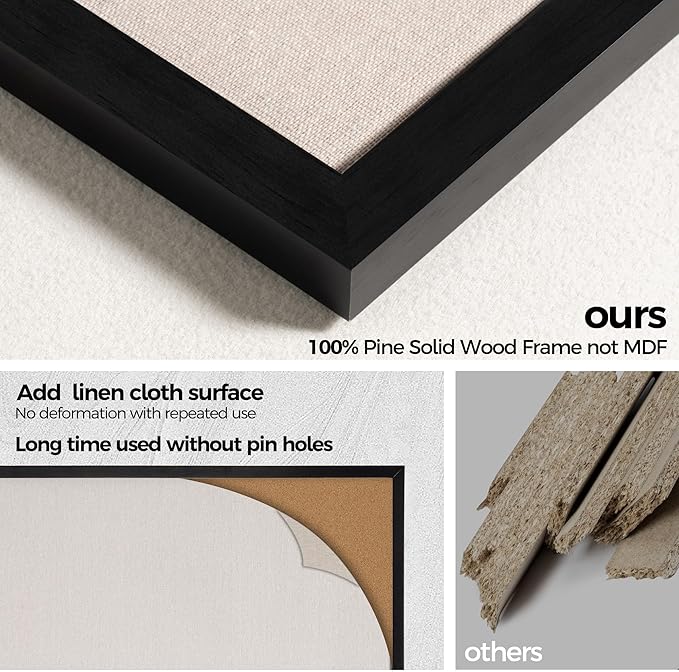 - Pine Frame Material: Our cork boards for walls is made of 100% pine wood which has well self-healing ability and repairability. The pin board features a four-ply splint design that is strong and thick enough not to be punctured by thumbtacks.