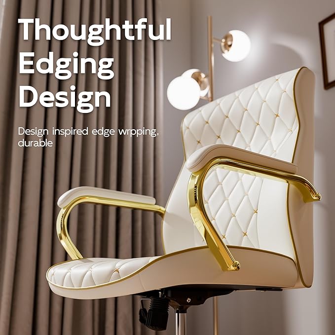 - Luxurious Diamond Quilted Design: The white and gold office chair features an exquisite diamond stitched quilted design that enhances the visual appeal of this leather office chair, adding a touch of elegance to any home or executive office space