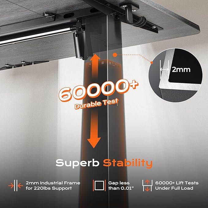 - 【Built to Last with Exceptional Stability】The industrial-grade steel frame and T-shaped design of the stand up desk support up to 220 lbs, ensuring stability and reliability for years to come. Paired with a durable motor, this home office desk is designed to meet the demands of your dynamic workday