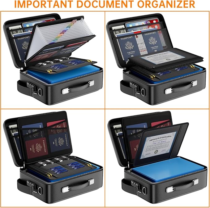 - Fireproof Box with Lock: Protect your valuables with the built-in high-quality combination lock (No keys required). Design with a strong handle&a detachable shoulder strap for carrying everything you needed easily. The fireproof box is suitable for business, travel, office, school, home storage, of course, giving it as a gift to your family is also a good choice. Fireproof box is both fireproof and water-resistant, ensuring your documents stay protected during fires, floods, or wet weather