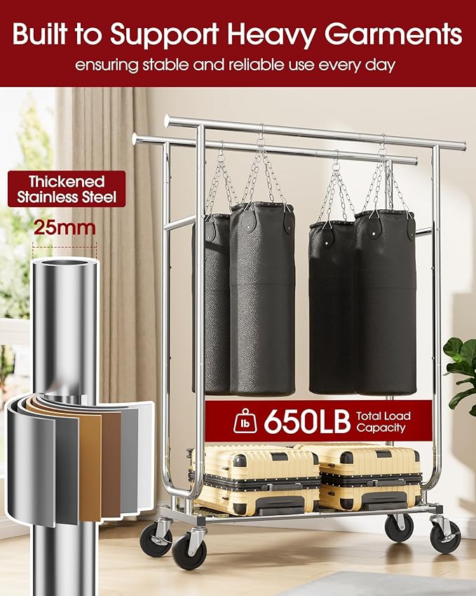 - HEAVY-DUTY SUPPORT: Made from premium stainless steel, this portable clothes rack for hanging clothes combines durability with a sleek appearance. The U-shaped side base enhances balance by distributing weight evenly, while the side rods reinforce the overall frame. It holds up to 650 lb, making it ideal for heavy winter garments.