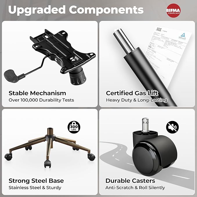 - Sturdy Construction: This padded task armchair features strong metal frame, curved backrest brackets that follow the curve of the human spine for stress relief, tested adjustment mechanisms and gaslift for stability even for tall and strong people, and high-quality 360Β° swivel rolling rotating casters avoid scratching the floor, can support up to 300 lbs. Whether you're working or relaxing, this modern chair offers a comfortable experience