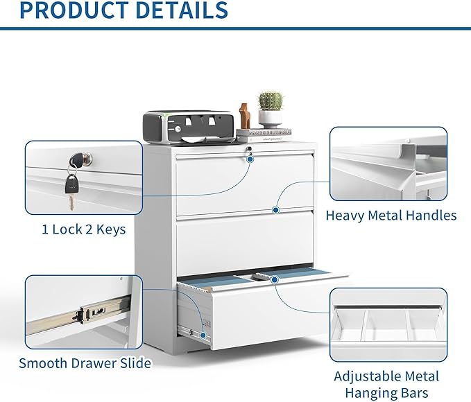 - 【Anti-tilt System】: This 3 drawer lateral file cabinet with lock meet your needs. It has has a anti-tilt design, ensuring that only one drawer can be open at a time. By preventing multiple drawers from being open simultaneously, the office cabinet maintains stability and greatly reduces the risk of tipping. You can have peace of mind knowing that your documents and equipment are secure.