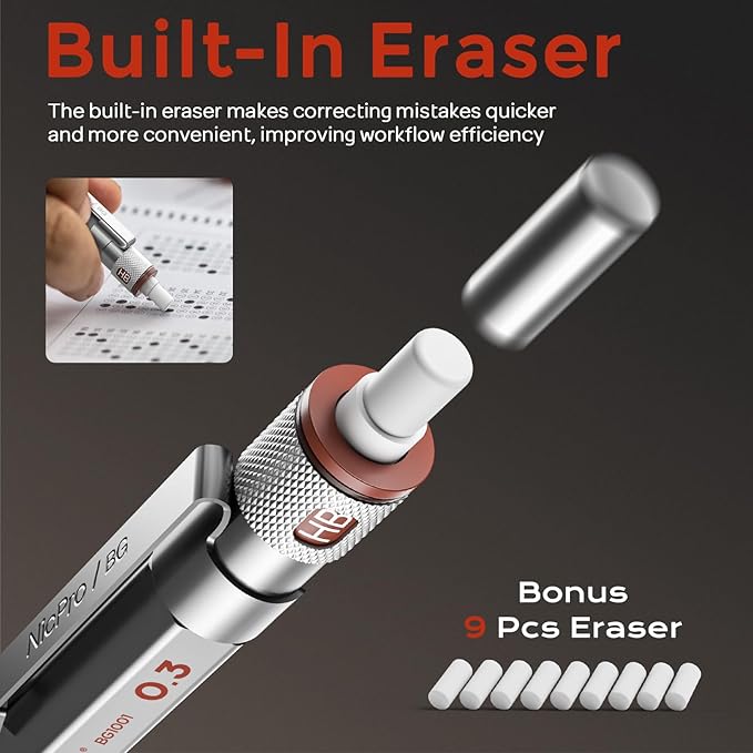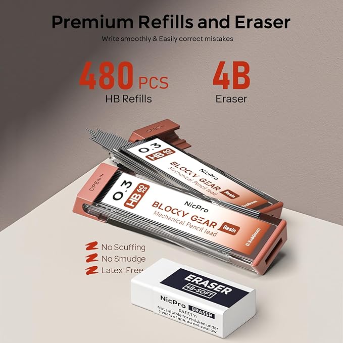 - Nicpro Blocky Gear:Come with 3PCS metal 0.3mm mechanical pencil and 8 tube of 0.3 mm lead refills (6 tube of HB and 2 tube of 2B), 60pcs / tube, 3pcs 4B latex-free eraser, 18pcs replaceable cap erasers,1 pcs kneaded eraser, all the stuff storage neatly in a case with flocking tray,what a gift for friends & family!Ideals for artists, professionals, teachers and students alike