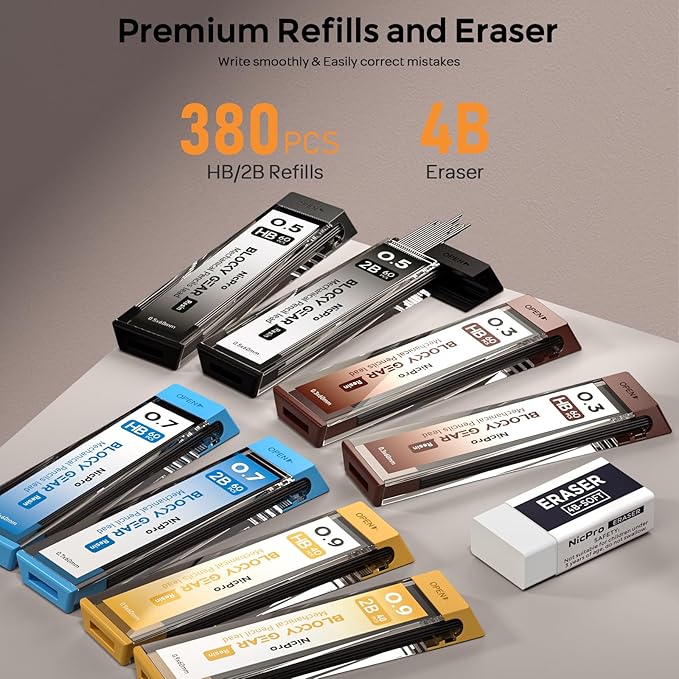 - Nicpro Blocky Gear: Come with 4pcs metal 0.3/0.5/0.7/0.9mm mechanical pencil and 8 tubes of replacement leads (3 tubes of 2B (0.5, 0.7, 0.9mm), 5 tubes of HB (2* 0.3mm, 0.5, 0.7, 0.9mm), 60 pcs/tube of 0.3/0.5/0.7mm lead; 40 pcs/tube of 0.9mm lead, 3pcs 4B latex-free eraser, 18pcs replaceable cap erasers,1 pcs kneaded eraser, all the stuff storage neatly in a case with flocking tray,what a gift for friends & family!Ideals for artists, professionals, teachers and students alike.