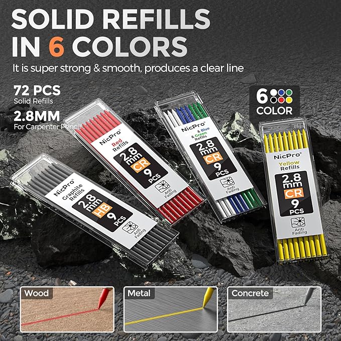 - Marks on Various SurfacesοΌ This work pencil is matched with a 2.8 mm thick color lead, It can mark on a variety of surfaces, including rough, smooth, dry, and wet materials like wood, metal, plastic, and concrete. Making it a standout choice for woodworkers, electricians, and other tradespeople