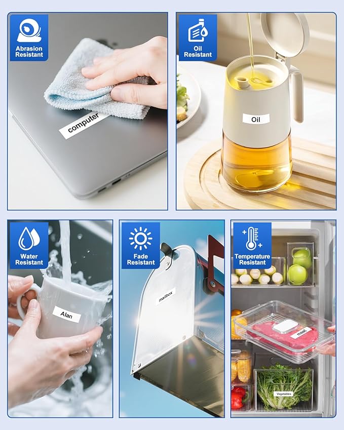 - Features: Our 12mm label maker tape split design makes the label tape easy to peel and apply, with strong adhesion/waterproof/temperature/oil/abrasion/fading, and reliably sticking to various surfaces